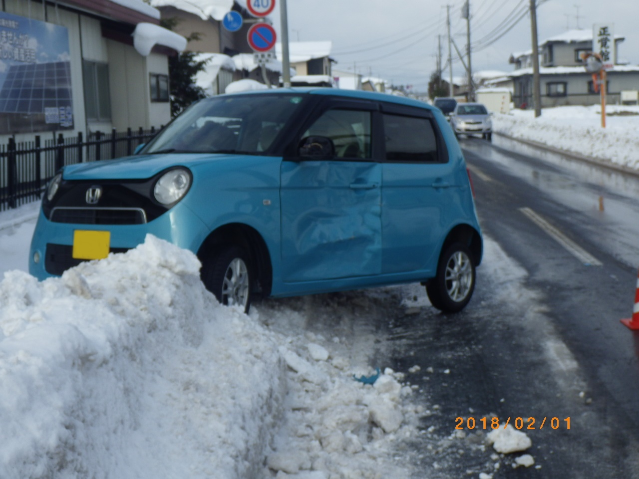 社員も退避しようと右にハンドルを切ったようですが、路面が凍結しておりほぼ真っすぐに相手車両の左側面に衝突したようです。(幸い大けがではありませんでしたが、社員は胸の痛みと首をの痛みを訴え現在も通院中)