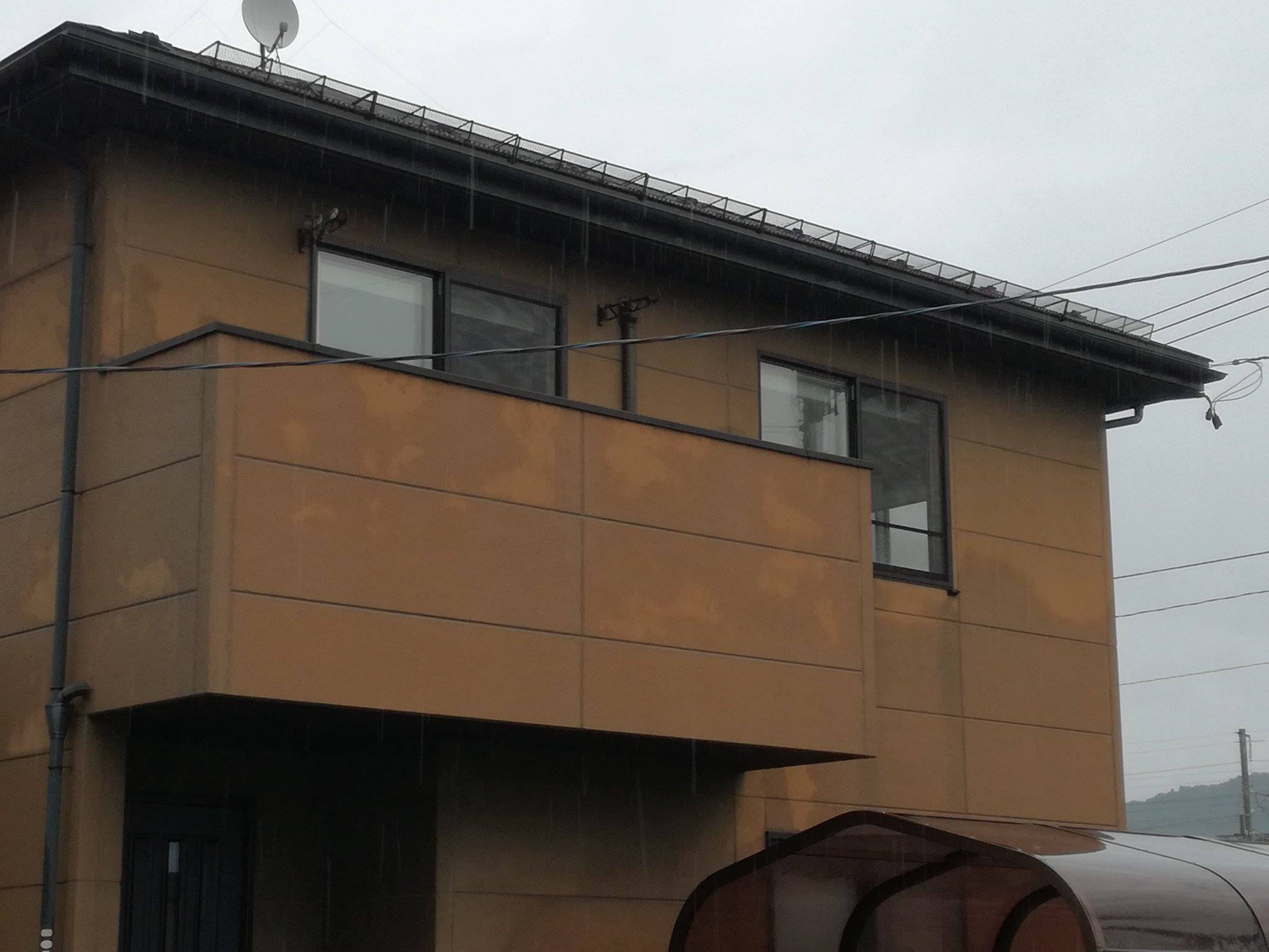 降り始めた雨に濡れた外壁。次第に雨水がしみ込んでいる様子なのです。