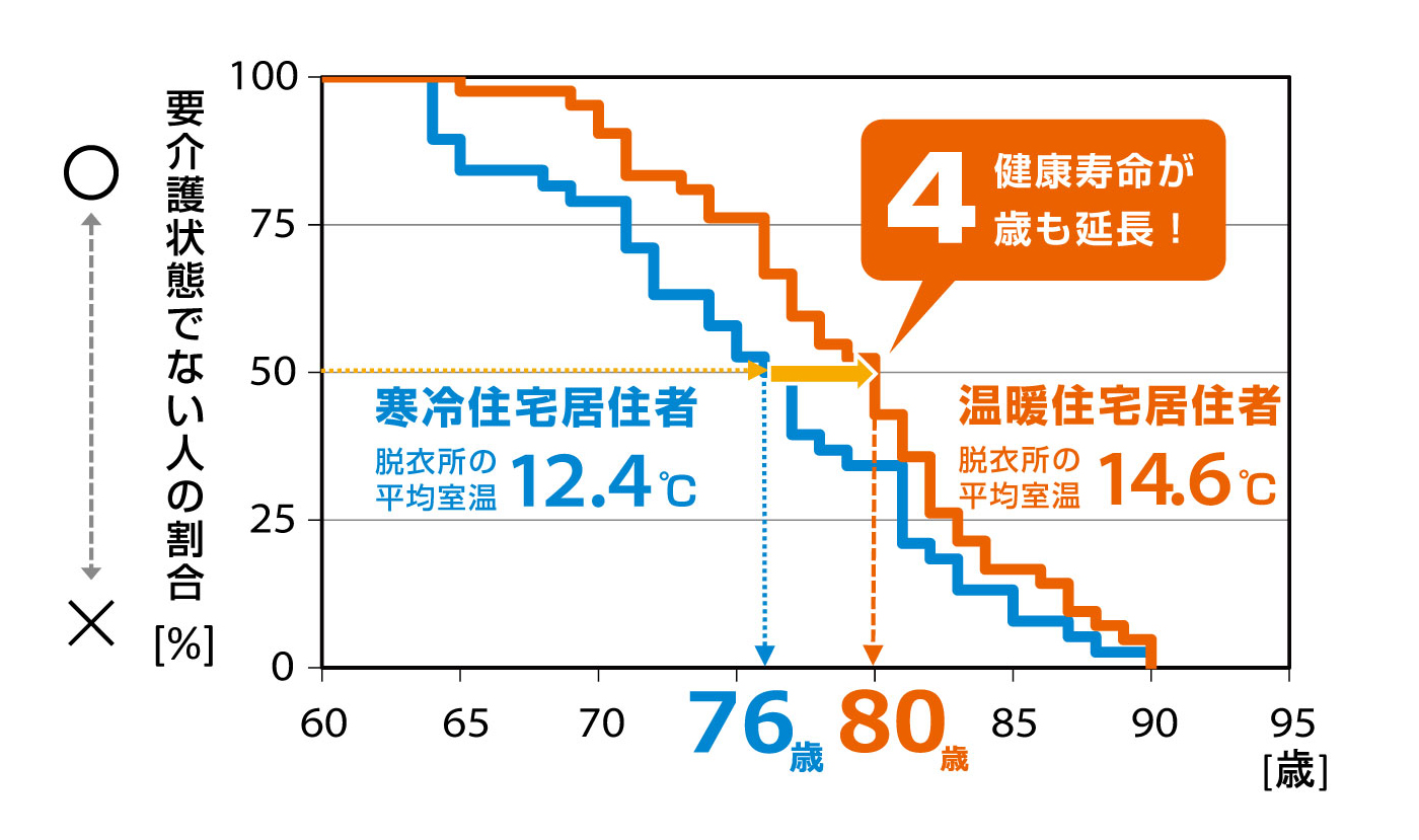出展:林侑江、伊香賀俊治、星旦二、安藤真太朗:住宅内温熱環境と居住者の介護予防に関するイベントヒストリー分析-冬季の住宅内温熱環境が要介護状態に及ぼす影響の実態調査-日本建築学会環境系論文集第81巻第729号、(2016.11)