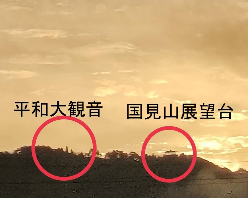 この写真は、平和大観音と国見山展望台の間からお日様が昇る直前のものです。