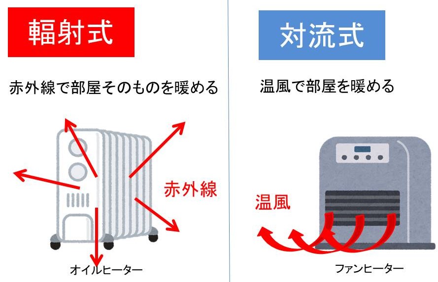 暖房器具には「対流(温風)式」と「輻射式」があります。