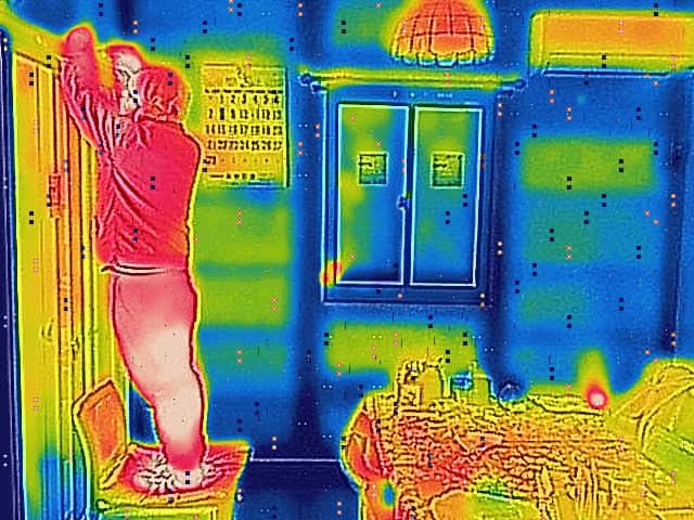右上のエアコンや左の人間は暖かいので赤く写って