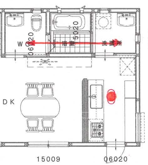 そこを動線の基準と考え、水回りを近くに並べます。