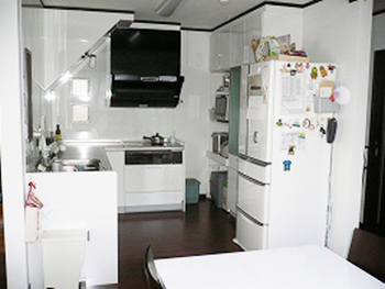 | ダイニングです。これまでは用途別に部屋が作られておりひとつひとつの部屋がとても狭く無駄な廊下もありました。 | リフォーム前はキッチンから他の部屋の様子が分からない間取りでした。 | リフォーム後はLDKの大空間が常に家族の集まる場所になります。 |