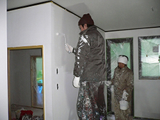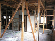 | 今回はシェルペイントを採用いただきましたローラーで仕上げる壁材です。 | 床下には断熱材をしっかり敷き詰め下からの冷気を防ぎます。 | 大きな梁は補強のためですが今回は化粧として使用しました。 |