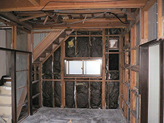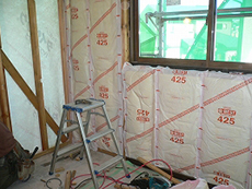 | 防湿シートも兼ねるグラスウールを採用し、施工も簡単なQベスト工法で仕上げます。 | これはグラスウールを施工する前です。 | 壁の上下に気流止めなるものを施工しました。 |